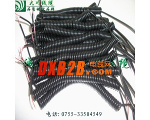 彈簧線(又叫彈弓線、電話線、螺旋線、卷線、伸縮線、曲線),按材質(zhì)可分:PU彈簧線、PVC彈簧線、PE彈簧線,產(chǎn)品大致可分為插頭彈簧線、塑膠彈簧線、編制屏蔽彈簧線、點煙器彈簧線、DC頭彈簧線等,彈簧線是一種利用可伸縮性來工作的設(shè)備連接線。一般用TPU電纜繞制而成。用以控制可移動設(shè)備運動的電連接、可在短時間內(nèi)迅速回彈,一般是由TPR/TPU/TPE/ PVC電纜繞制而成。而采用最多的是PU/TPU,PU/TPU是熱塑性聚氨酯( TPU )彈性體 ,是無毒環(huán)保的高分子聚合物,具有其它塑料材料所無法比擬的強度高﹑韌性好﹑耐磨﹑耐寒﹑耐高溫、耐油﹑耐水﹑耐老化﹑耐氣候等特性 ,同時他具有高防水性透濕性﹑防風(fēng)﹑防寒﹑抗菌﹑防霉﹑保暖﹑抗微生物、環(huán)保型柔性電纜、抗紫外線以及能量釋放等許多優(yōu)異的功能;它的硬度范圍 50a-82D ,用傳統(tǒng)的熱塑性塑料的加工方法,如注塑,擠出,壓延,吹塑, 熔鑄成型法等,均可方便地加工該產(chǎn)品。