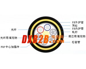 光纖以一定的余長置于填充阻水油膏的PBT(或其他合適材料)管中,根據(jù)所需要的抗拉強度繞包合適的紡綸紗,再擠制PE(≤12KV電場強度)或AT(≤20KV電場強度)護套。